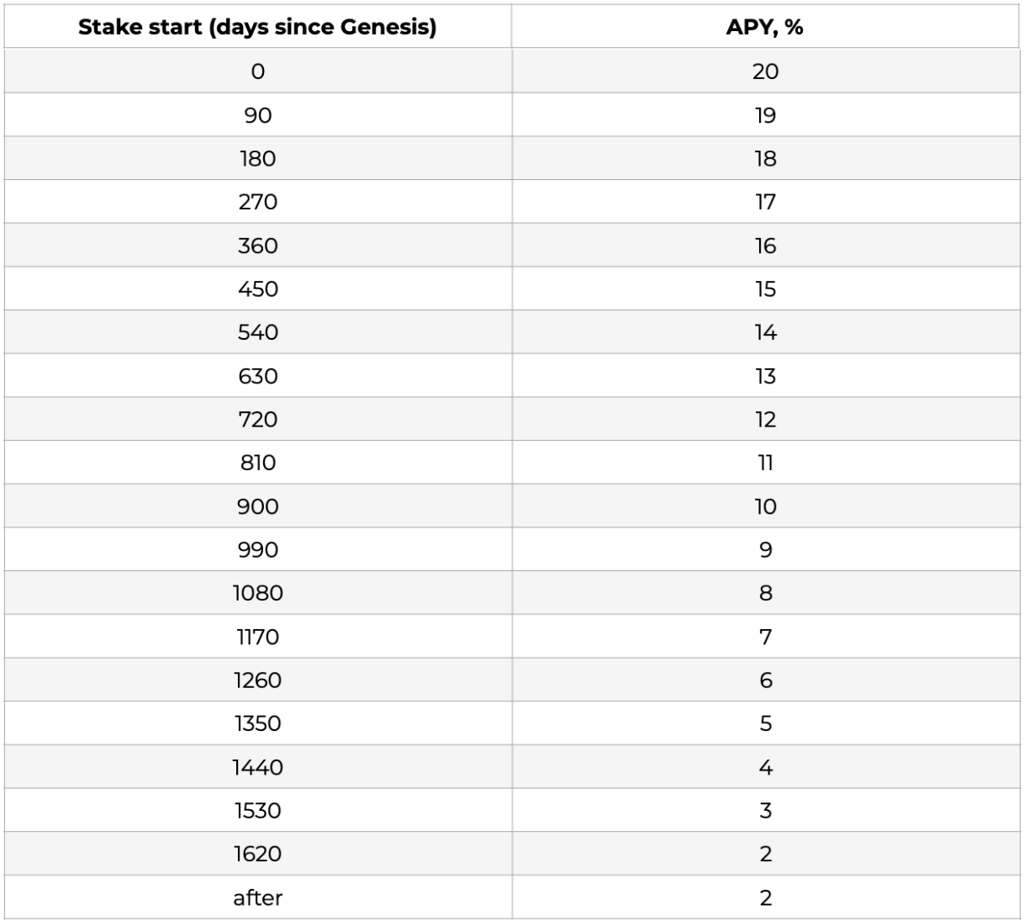 You can stake XEN for any number of days between 1 and 1,000 and receive APY rewards. The APY rewards will start at 20% on XEN Genesis and decrease by 1 percentage point every 90 days until it reaches 2%, which will stay at 2% indefinitely. The APY for each stake is fixed at the time of the stake, depending on how many days have passed since XEN Genesis.